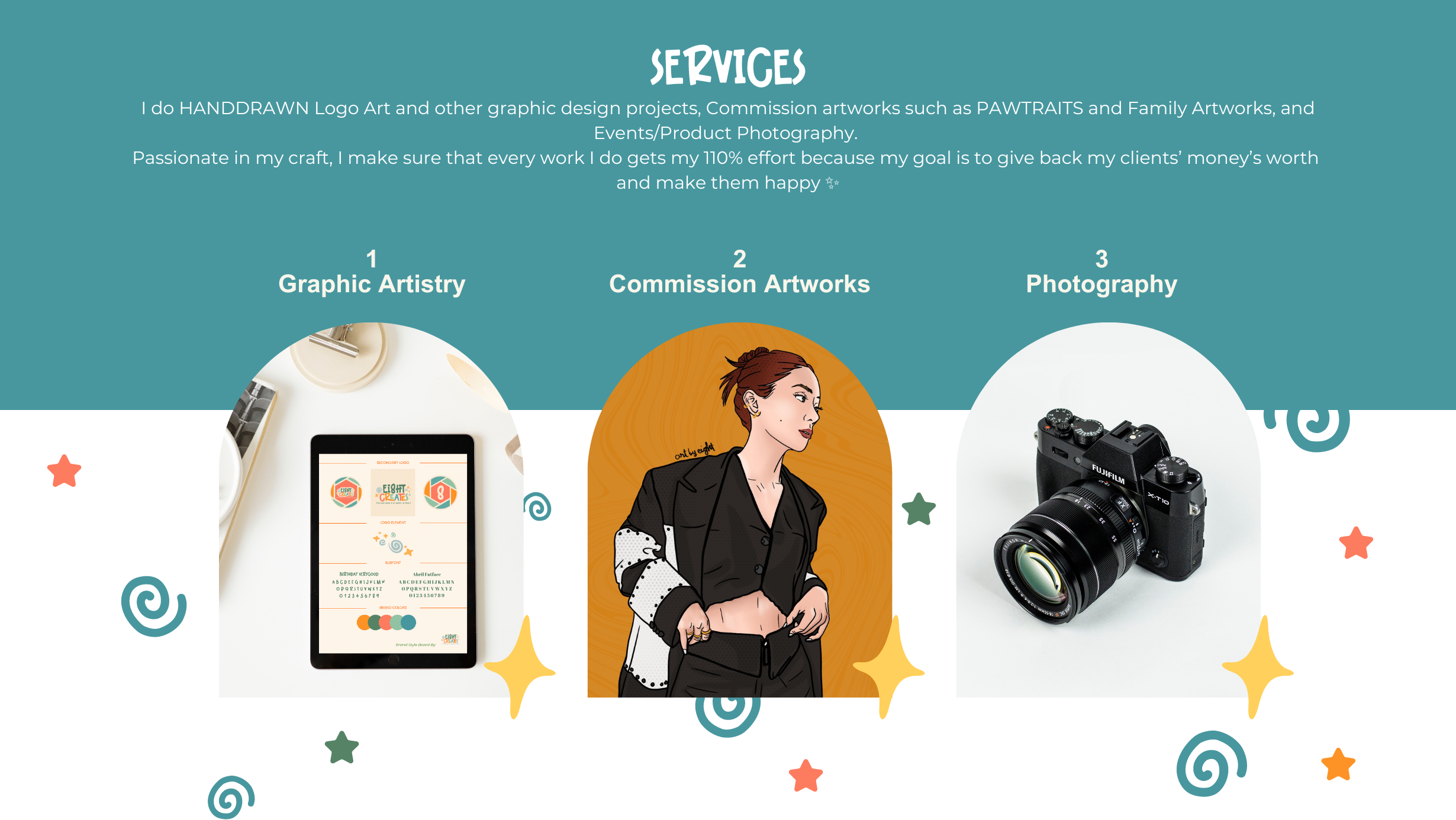 Logo designing, Business or Brand Profile Presentation Layouting, Commissioned Artworks, Photography and currently studying web designing via carrd.co.Below you will see samples of my works by category. Because most of my clients want to keep their projects with me private, all works posted are actual projects with acquired permission to post by my customers.please please please do not steal these. thank you
