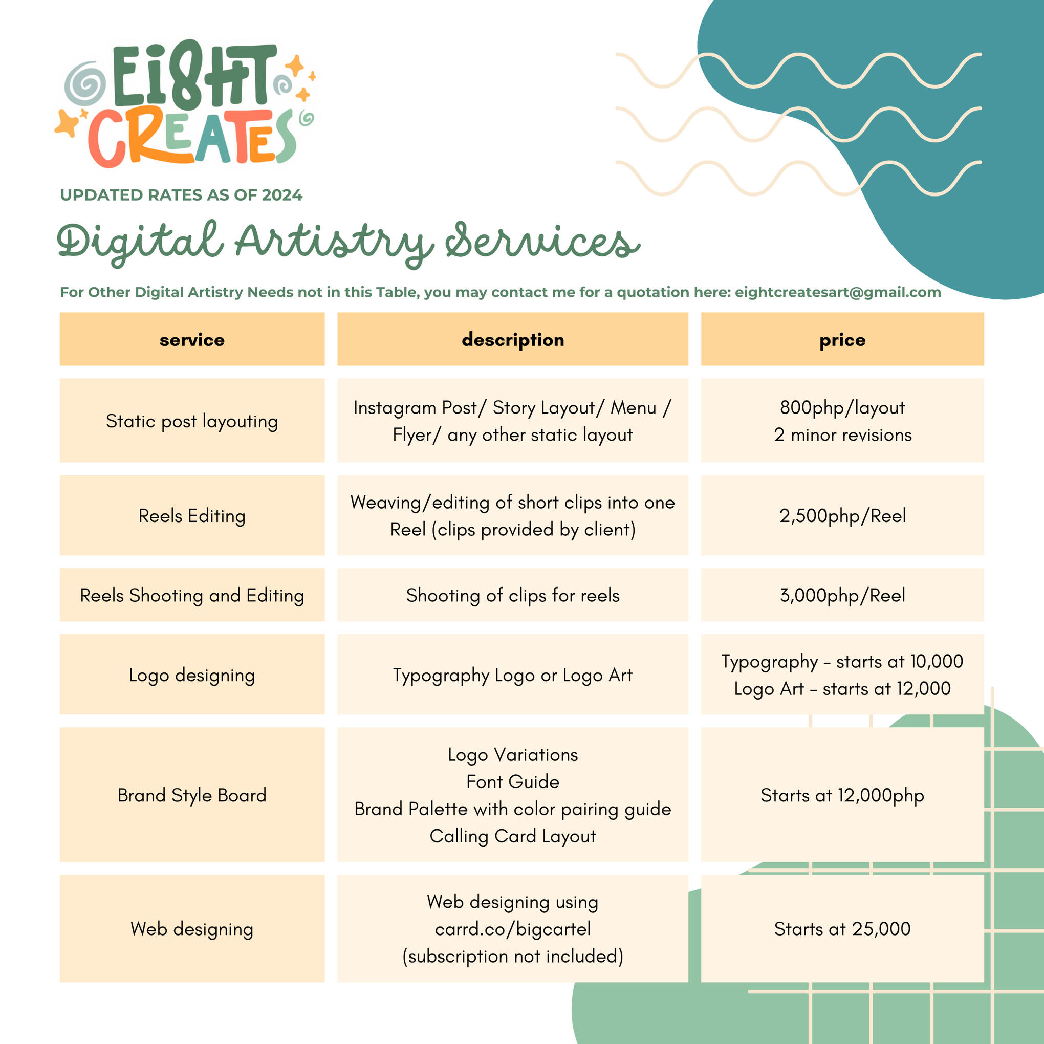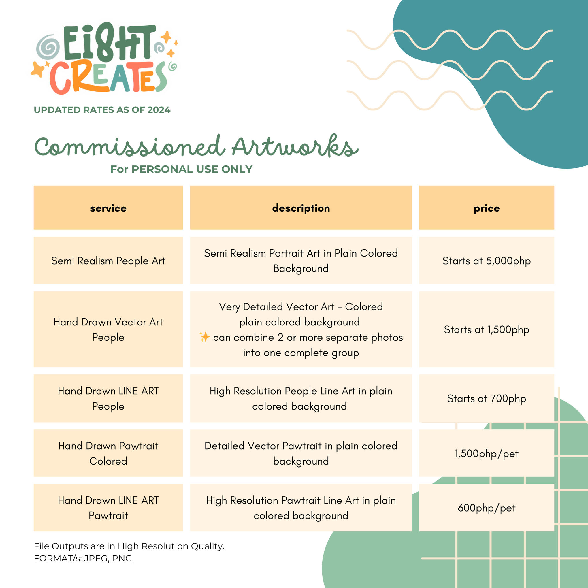 Deadline will be moved if payment wasnt settled BEFORE the booked slot ✨I have the rights to decline the project if deadlines are not do-able or timeline is not realistic. ✨Do you do Rushed Art Projects?Please note that I do multiple Art Projects simultaneously so I work under a strategically plotted timeline. Therefore, RUSHED ART PROJECTS are welcome depending on my current calendar. Feel free to inquire about availability 😊✨How long does it take for a project to finish?Commissioned Artworks usually take 2-5days from commencement date and art style availed. Feel free to refer to our rates page for the specified days to finish per art style.For Logo Artistry and other Art Designing, it will depend on the speed of replies of client feedbacks every mockup and revision made but mockups are usually out in 5-7days after the first study depending on the complexity of the art and design.Website layouting and other Branding Layouting services are done in a maximum of 1 month only. I will require strict timeline for feedbacks every after revision to meet the proper deadlines.What is your payment method?I REQUIRE full payment upfront BEFORE commencement date to avoid any complications after the artworks are done.Remember, these artworks involve HOURS of work to finish a draft. Therefore, to avoid the complications of not getting paid after the drafts are made, I am strict about paying full upfront. Hope you understand. ✨Payments can be sent thru Paypal, GCash or BDO.How many revisions do you allow?All Commissioned Arts are inclusive of 2 MINOR REVISIONS.All Logo Artworks are inclusive of 1 MAJOR Revision and 2 MINOR Revisions.